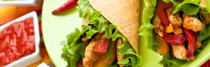 - Τοποθετείτε ένα φύλλο μαρουλιού στο κέντρο της κάθε τορτίγια και επάνω του το ένα τέταρτο του μείγματος κοτόπουλου. Τυλίγετε όπως τυλίγουμε ένα burrito.