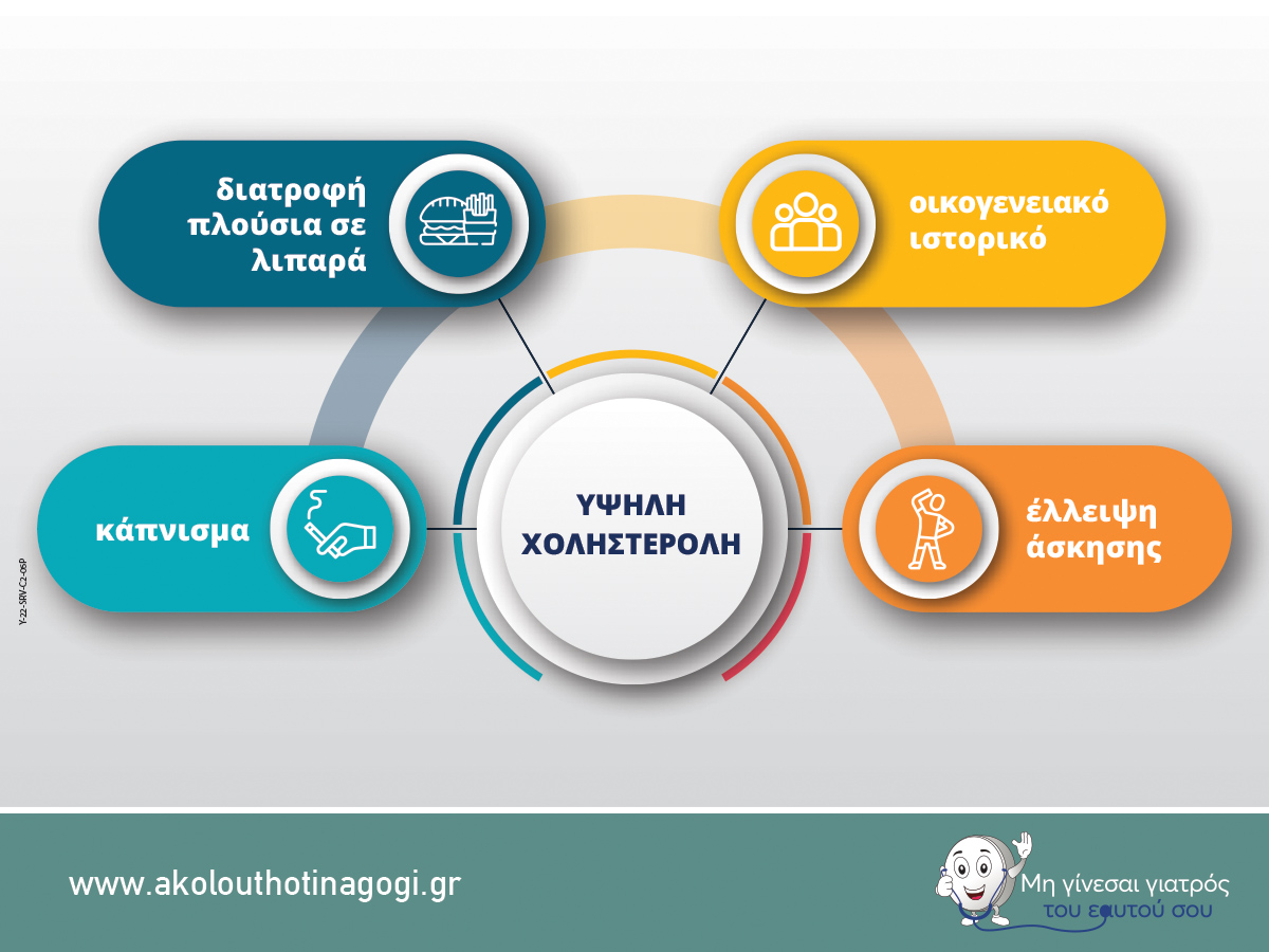 Γνωρίζεις ότι η πλούσια σε λιπαρά διατροφή δεν είναι ο μοναδικός παράγοντας κινδύνου για την εμφάνιση υψηλής χοληστερόλης (δισλιπιδαιμίας); Το οικογενειακό ιστορικό, το κάπνισμα και η έλλειψη άσκησης είναι πρόσθετοι επιβαρυντικοί παράγοντες.