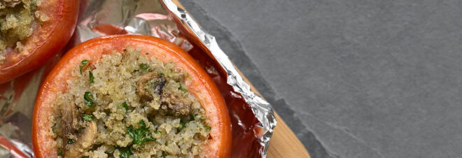Γεμιστές ντομάτες με κινόα 2 μερίδες Συστατικά: 50 g άψητη κινόα 38 g τυρί…